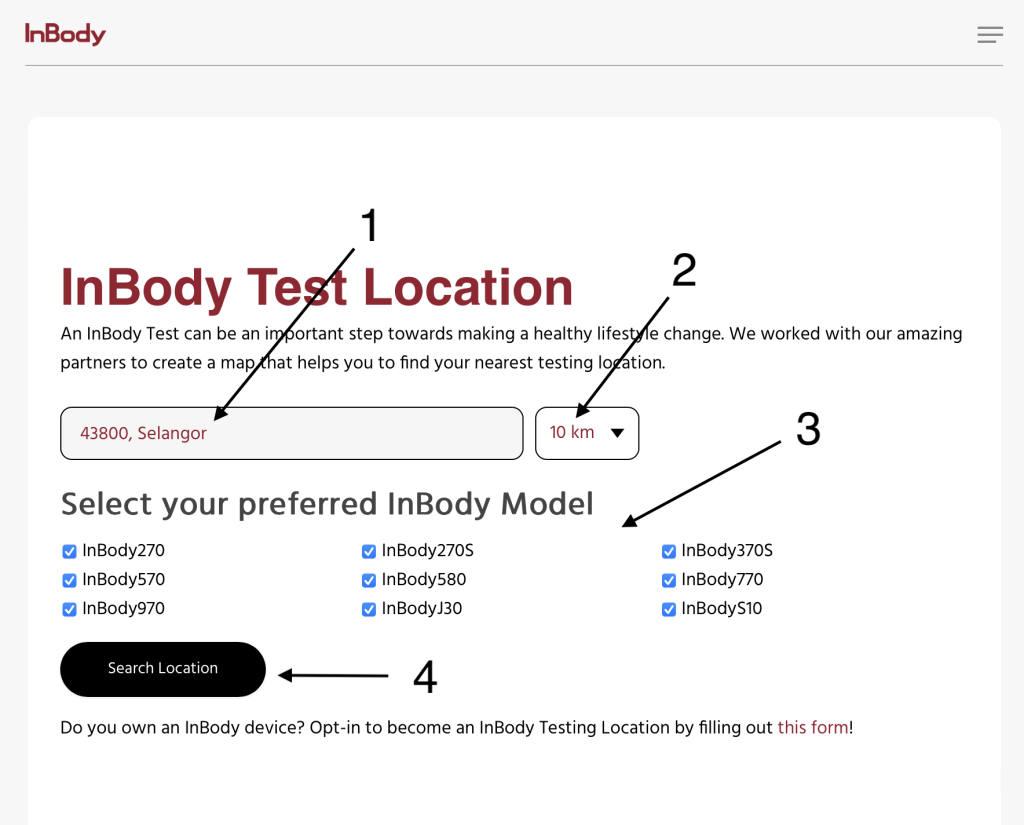 Untuk ujian in-body sila layari https://inbodyasia.com/location/ dan masukkan post code, pilih radius, tick semua machine dan klik “Search location”